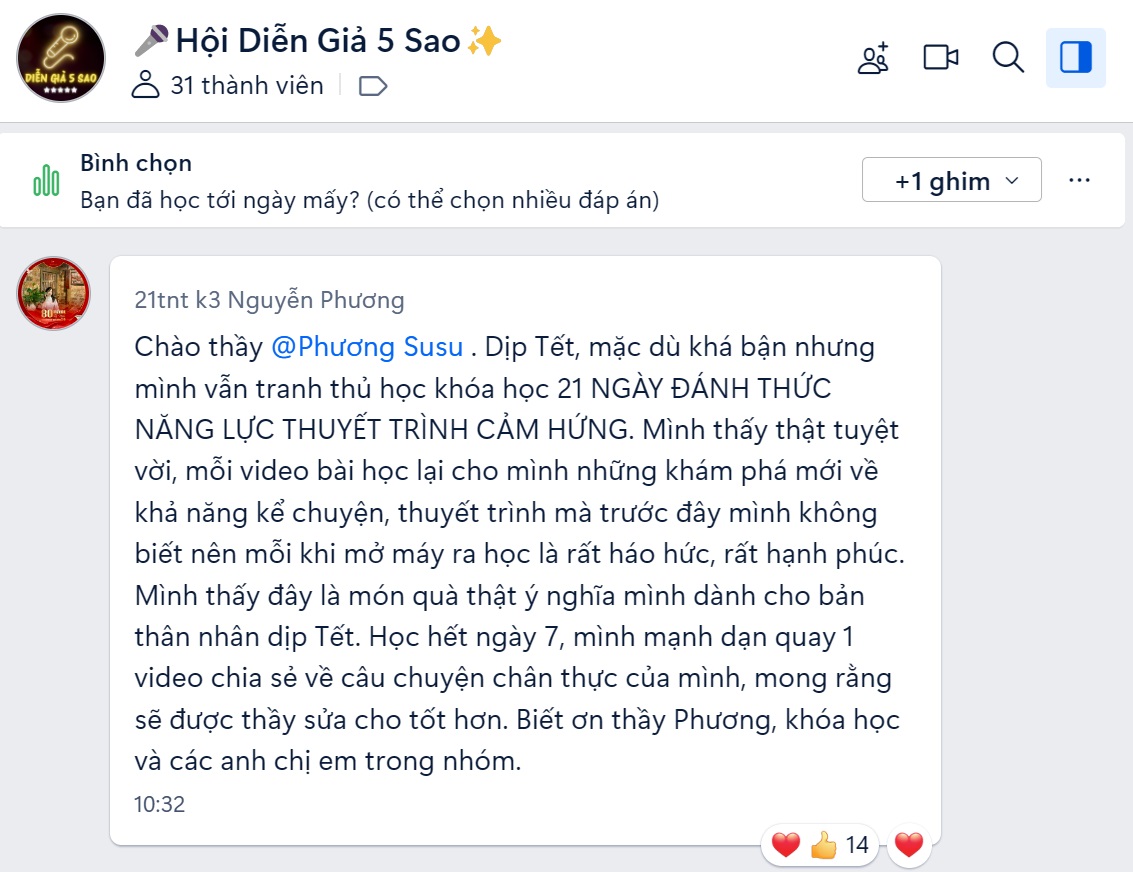 Thế nên, từ tháng 3/2025, tôi đã cố gắng sắp xếp thời gian để giúp đỡ những người mong muốn được tôi đồng hành 1-1 hàng tuần, giúp họ hoàn tất lộ trình Diễn Giả 5 Sao này.